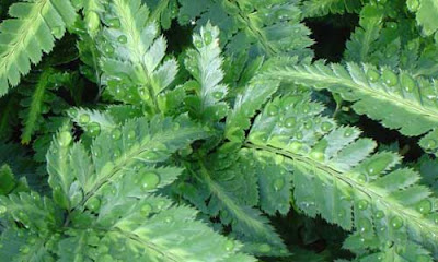 Ferns evoke a sense of rich mystery in the landscape, like that of a lush woodland. Their fragile appearance belies their toughness. Rather than being difficult to grow, ferns are solution plants for many of the difficult landscape problems that gardeners face. They thrive in shady, moist areas and love acid soil. Plant them around the base of trees, in dark and moist areas around the foundation of your home, behind walls or utility buildings, at the edge of wooded areas. They may grow where ever they find a foothold between cobblestones and bricks. They are great for those transitional zones between lawn and wooded areas.
